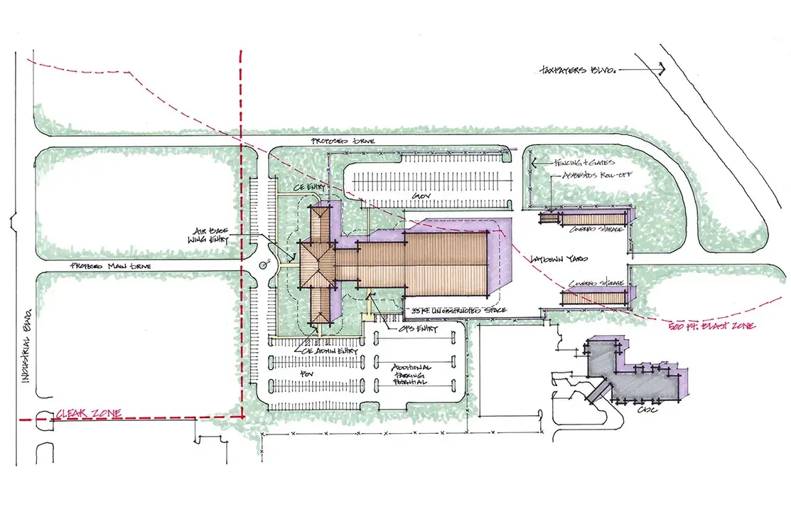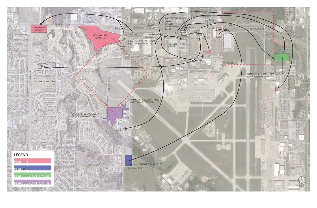 Blair Remy was tasked with providing Planning Charrette Report documents to determine the impact that the planned relocation of Interstate-40 will have on facilities and land owned by Tinker AFB, and to develop a plan to relocate assets and mission functions that will be displaced. This effort also included the development of two conceptual designs for a future consolidated facility to house all of Tinker’s Civil Engineering staff and commander.
